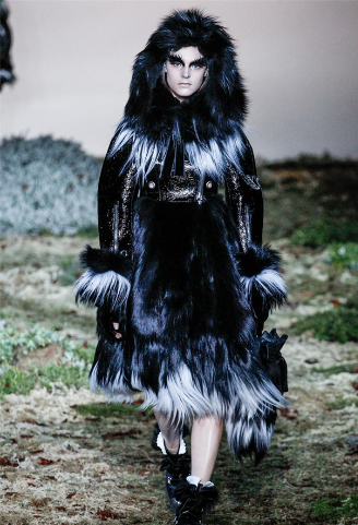 1,T臺無形勝過有形!T臺可以變為草地曠野,如電影中叢林女神幽靈掠過,呵呵,美女和野獸,一個狂野唯美的童話。亞歷山大·麥昆 (Alexander McQueen) 2014秋冬女裝秀的地板被布置成長滿苔蘚、石南的森林綠地,模特們穿著山羊皮、臭鼬毛皮和狐貍皮的外套遠遠走來,體積龐大如同笨重的北極熊。16、17世紀宮廷風格的泡泡袖、高領、束腰裝飾和白色網眼裙又讓這些耳鬢兩縷長發的模特像從遠古穿越而來一般的疏離。
