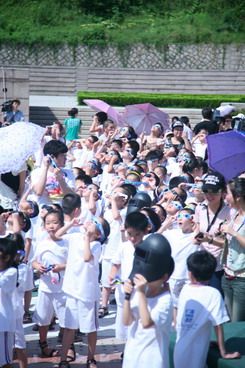 7月22日,活動策劃,溫州青少年活動中心組織第八屆暑期素質訓練營全體營員參加天文觀測活動,并邀請溫州市中學地理老師李小東現場為營員們講解有關日全食、日偏食的天文知識,并指導營員們如何正確觀測日偏食。當天上午9時10分至9時40分,活動中心845名素質訓練營營員帶著自制的觀測鏡齊聚廣場,上演了一幕千人“追日”的盛景。