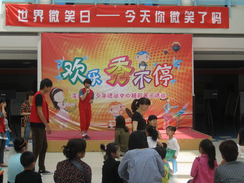 2012年5月6日上午,溫州青少年活動(dòng)中心圍繞“世界微笑日 ---今天你微笑了嗎”這一主題在中心大廳開展了由浙江工貿(mào)職業(yè)技術(shù)學(xué)院志愿者組織的最美微笑趣味活動(dòng)。志愿者們將活動(dòng)分為搶凳子、水果蹲、猜謎語三個(gè)環(huán)節(jié)。游戲的趣味及互動(dòng)性,帶動(dòng)起現(xiàn)場的家長和孩子們共同參與到上午的活動(dòng)中。參與活動(dòng)的小朋友和家長均能獲得一份小小的紀(jì)念品。活動(dòng)現(xiàn)場家長和孩子們踴躍參與,特別是在水果蹲這個(gè)游戲環(huán)節(jié)中,小朋友們注意力高度集中的那種專注神情,迎來現(xiàn)場觀看者的陣陣掌聲。活動(dòng)在大家的歡聲笑語中結(jié)束,小朋友們都表示今天上午在活動(dòng)中心玩得非常開心,很多家長也表示希望繼續(xù)開展更多有意義的活動(dòng)。