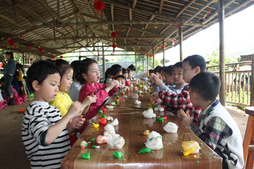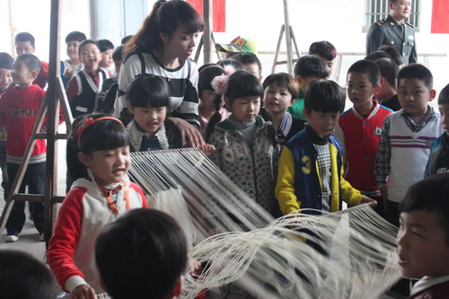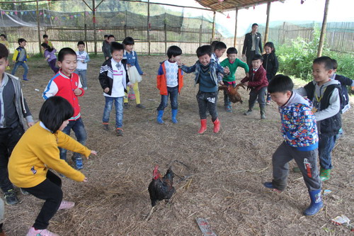 一路上,孩子們歡聲笑語,歌聲不斷,不知不覺便抵達了目的地——瑞安谷歌青少年教育基地。老天也很厚愛孩子們,雨竟然停了,天空放晴。到達谷歌后,孩子們首先體驗了傳統手工藝——做紗面。在體驗過程中,孩子們表現出非常高的興致,在老伯伯的細心指導示范下,個個儼然像似熟練的小技工,做得像模像樣。在游戲環節中,最有趣的活動還數“捉公雞”,在圍有四、五只大公雞的圍欄中,孩子們使出渾身解數,追趕著、捉拿著,追得大公雞四處逃命,無處藏身…..最后,只好乖乖地蹲在圍欄角落,任憑發落,孩子們為自己獲得的“戰利品”開心極了!
