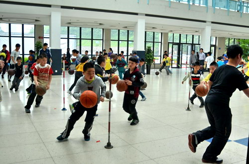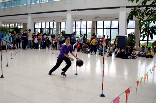 4月21日上午,籃球班60多名學員在老師們的組織下在中心一樓大廳舉行了趣味籃球賽活動。首先進行的是運球過障礙比賽,活動策劃,在裁判員的一聲哨響之后,學員們排成了一條長龍,沿著標桿魚貫而入式的運球表演贏得了在場家長學員們的陣陣掌聲。中場休息的時候,一位學員的轉球表演秀更是將比賽帶入了高潮。
